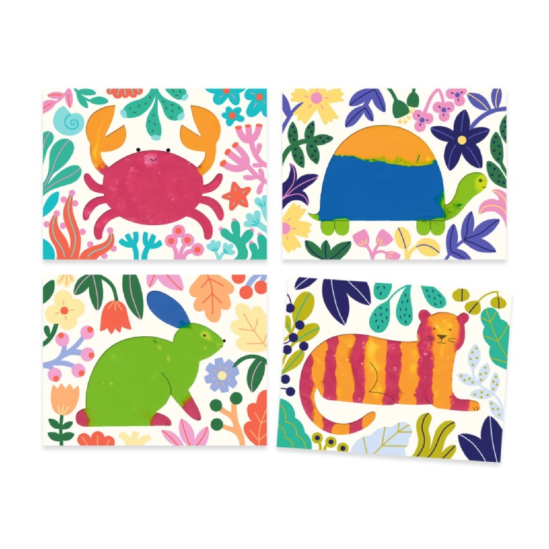 L'enfant va ouvrir la pochette plastifiée, y verser de la peinture puis refermer la pochette. Il va alors s'amuser à colorier les animaux en étalant la peinture en passant les doigts sur la pochette et donc sans se salir les mains ni en mettre partout.